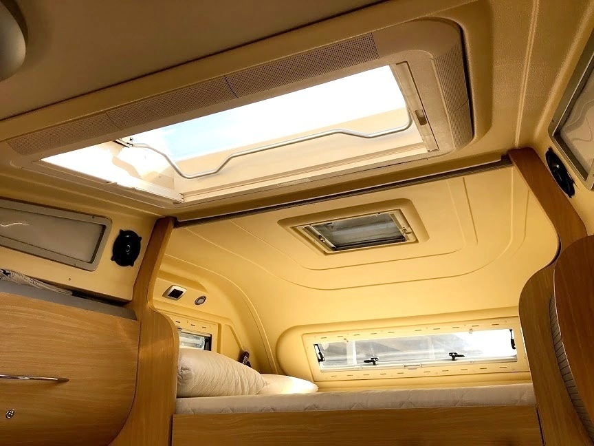 Situé à l'avant au dessus du poste de conduite et accessible via une échelle. Très confort, ce lit permet aussi de conserver de l'espace de vie.