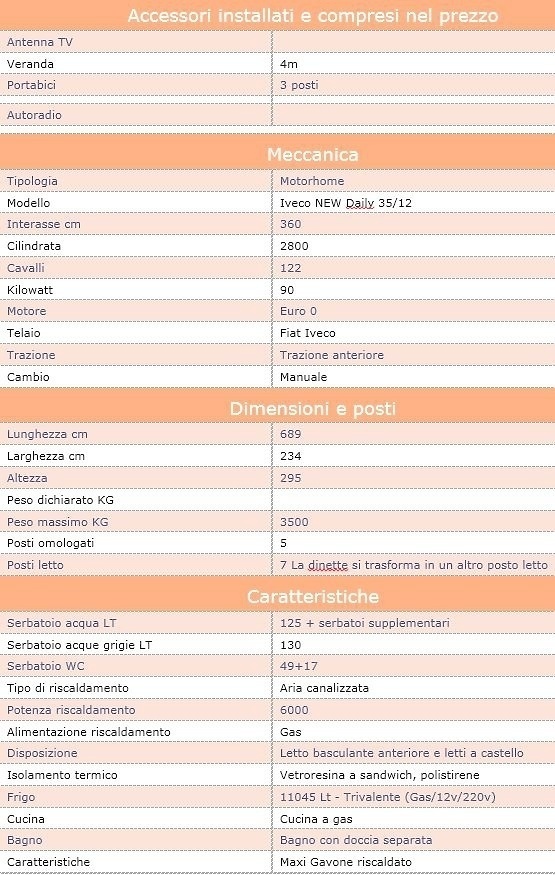 Camping-car Laika Ecovip 200i, longueur x largeur x hauteur 690 x 232 x 295, 3500 Kg, 5 places avec ceintures de sécurité et 7 couchages, direction assistée, radio, batterie de service, panneau photovoltaïque, réfrigérateur trivalent Dometic, poêle Trumatic, gaz, 2 bouteilles de gaz de 10 kg, WC intégré 54 litres, auvent Fiamma F45, porte-vélos 3 places, échelle et porte-colis, réservoirs d'eau 120 + 80 + 80 litres, réservoir eaux grises 120 litres, raccordement douche externe, paire de cales d'arrêt de nivellement, casseroles, couverts, barbecue, parasol, table et tabourets de camping en aluminium, tuyau avec raccord rapide pour l'alimentation en eau.